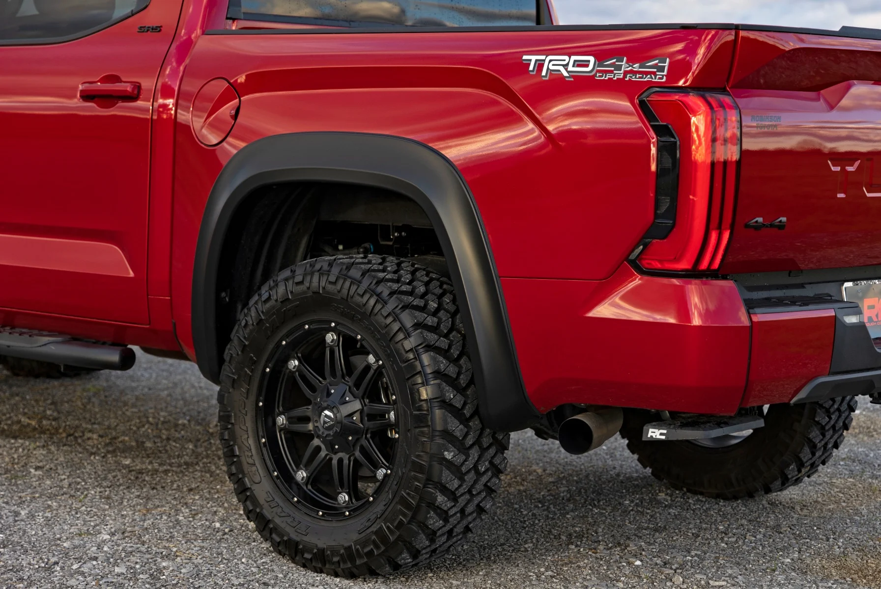Style and Protection. Unlock the power of real protection and custom style with Rough Country’s Sport Style Fender Flares for your Tundra! Offering 6 inches of Flare Height, you know your truck is getting the coverage it needs from flying debris and road grime. Not only will these flares safeguard your vehicle, but they will look great too – featuring a bold custom look that stands out and turns heads. Plus, if you want to take your customization game up a notch, these fender flares are easily paintable so they can match your truck in color and style. Get ready to rock this new rugged look – with Rough Country’s Tundra Sport Style Fender Flares!